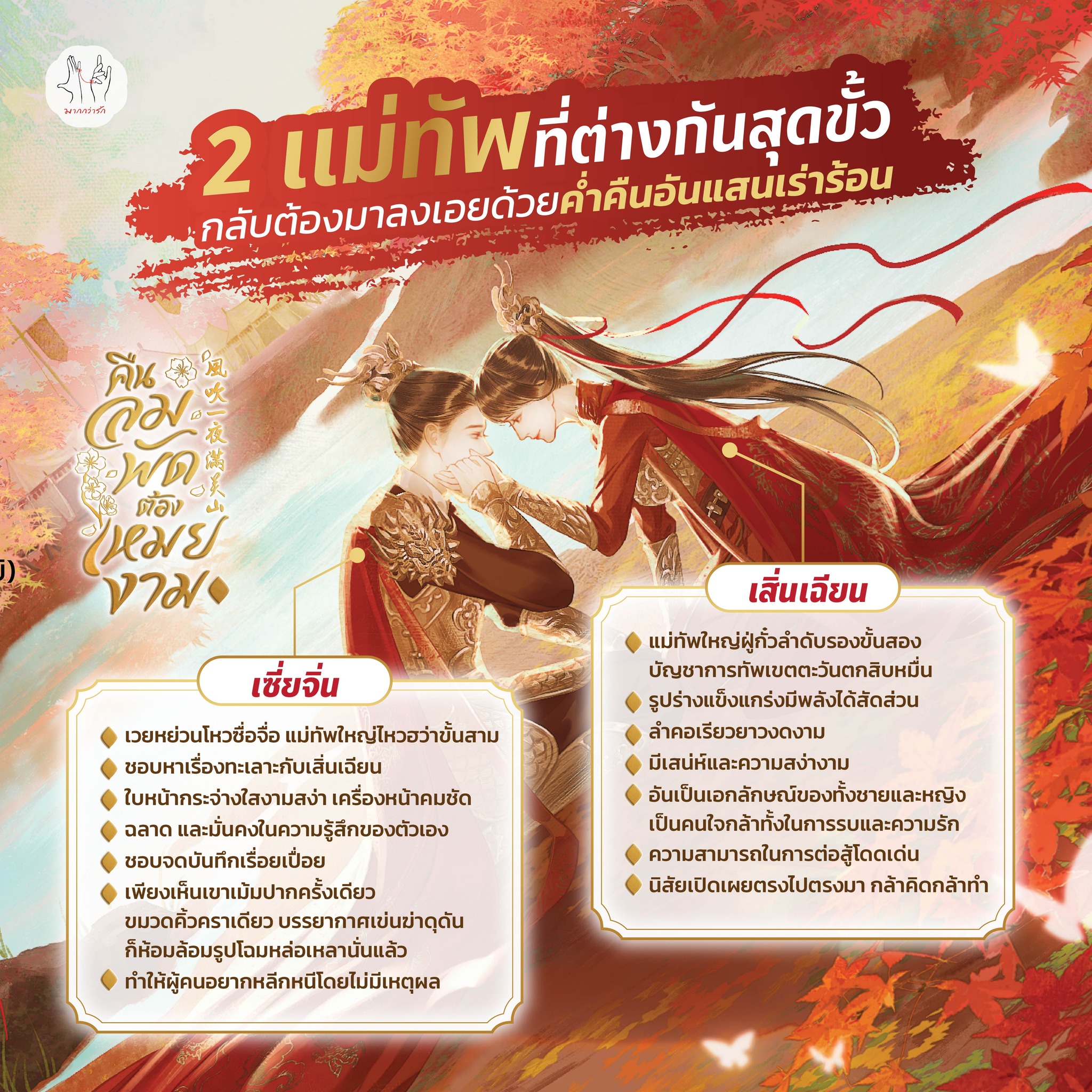นางเอกเรื่องนี้คือแกร่งในสนามรบ แต่กลับอ่อนไหวบนเตียง ส่วนพระเอกเป็นสายสุขุม คุมอำนาจอยู่หมัด แต่ดันหลงเสน่ห์ภรรยาตัวเองจนถอนตัวไม่ขึ้น ความสัมพันธ์ของทั้งคู่เลยไม่ได้มีแค่ความรัก แต่ผสมทั้งความใคร่ ความระแวง และเกมอำนาจ ฉากความสัมพันธ์ยามค่ำคืนทั้งผู้เขียนและผู้แปลถ่ายทอดออกมาได้ร้อนแรง แต่ไม่หลุดโทน ลึกซึ้ง มีอารมณ์ และสอดคล้องกับพัฒนาการของตัวละคร ไม่ใช่แค่ NC เพื่อความวาบหวิว แต่ช่วยขับเน้นความซับซ้อนของความสัมพันธ์ ท่านใดที่เป็นสายแม่ทัพชาย–หญิง การเมืองเข้มข้น ความรักที่เริ่มจากผลประโยชน์และความระแวง มีฉากเร่าร้อนแทรกอย่างพอดีและมีเหตุผล เรื่องนี้ถือว่าตอบโจทย์