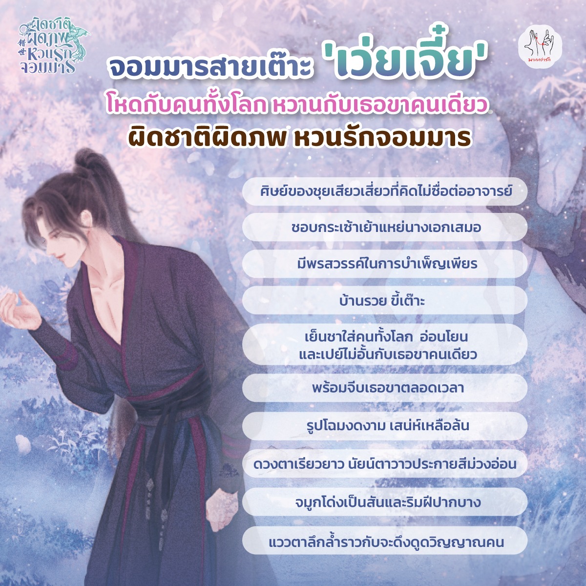 สำหรับสหายที่ชื่นชอบแนวศิษย์–อาจารย์ ปมชาติกำเนิด จอมมารกลับใจ และความรักที่ต้องต่อสู้กับชะตาฟ้า “ผิดชาติผิดภพ หวนรักจอมมาร” คืออีกเรื่องที่ไม่ควรพลาดเลยค่ะ อ่านแล้วทั้งลุ้น ทั้งเขิน ทั้งปวดใจเบาๆ ครบรสในเล่มเดียว ท่านหญิงเตือนแล้วนะคะ… ระวังจะวางไม่ลง