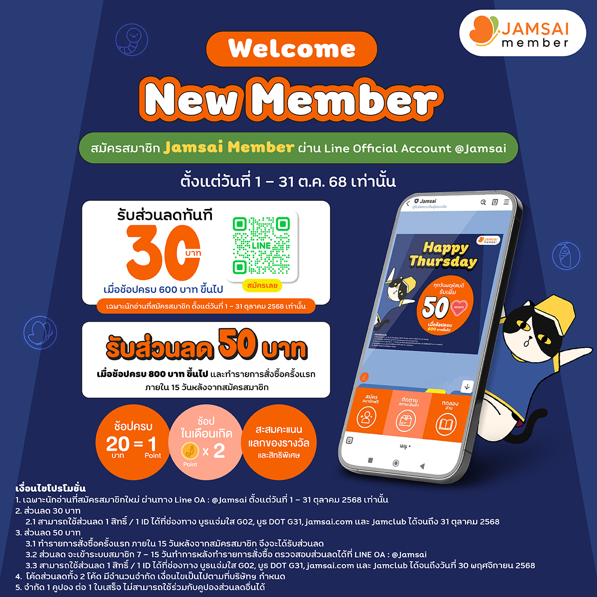 1. เฉพาะนักอ่านที่สมัครสมาชิกใหม่ ผ่าน Line OA : @Jamsai วันที่ 1 – 31 ต.ค. 68 เท่านั้น