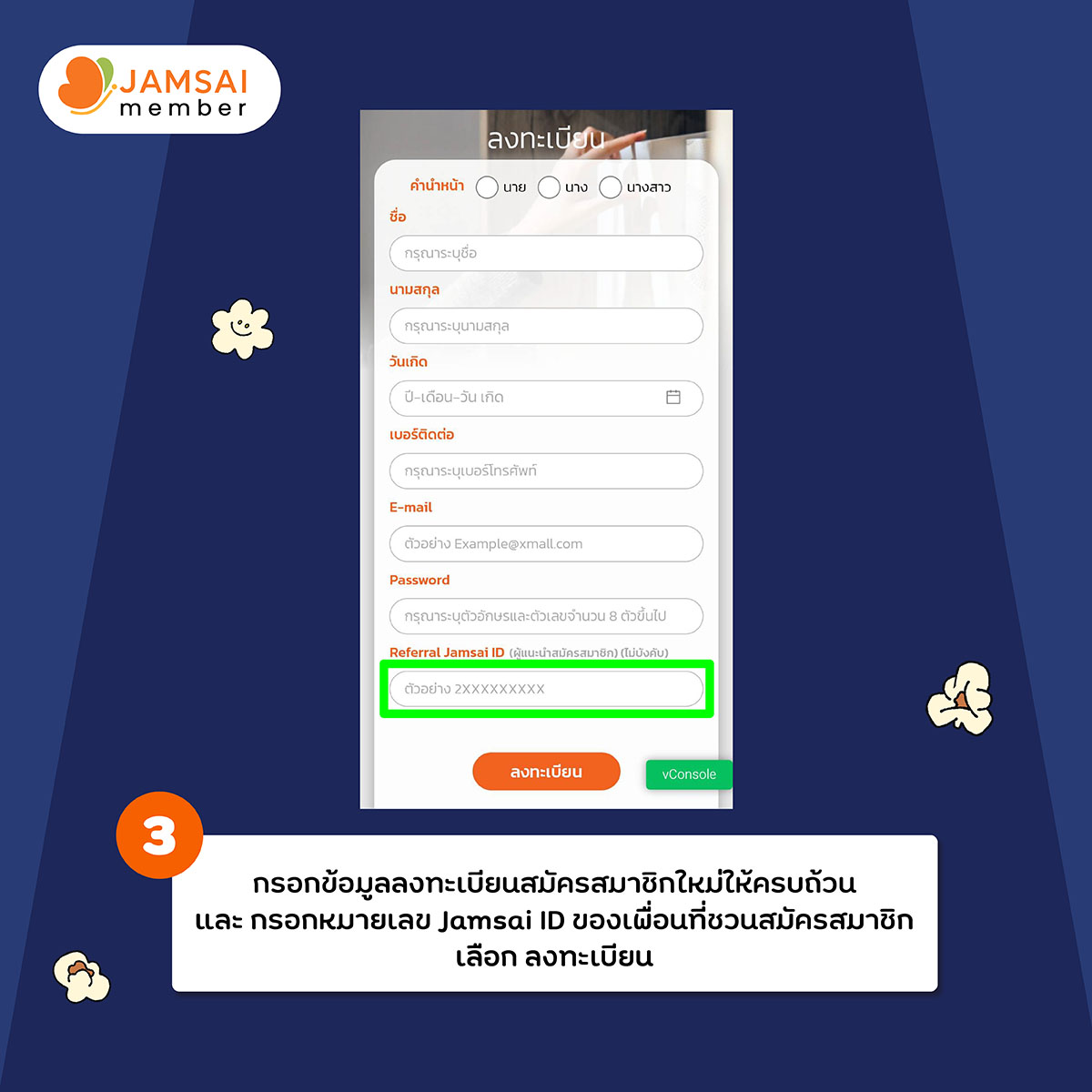 2. สมาชิกใหม่กรอกข้อมูลสมัครสมาชิกให้ครบถ้วน พร้อมกรอก Referral Jamsai ID ของเพื่อนที่แนะนำสมัครสมาชิก