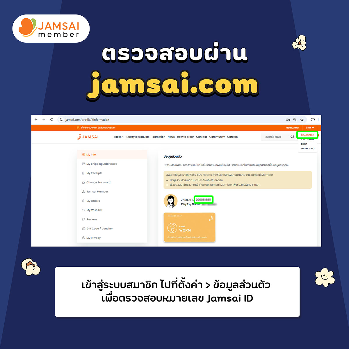 3. ส่วนลดจากการชวนเพื่อนสมัครสมาชิกใหม่ จะเข้าระบบสมาชิก 7 – 15 วันทำการหลังจากเพื่อนสมัครสมาชิกใหม่สำเร็จ ตรวจสอบได้ที่ LINE OA : @Jamsai