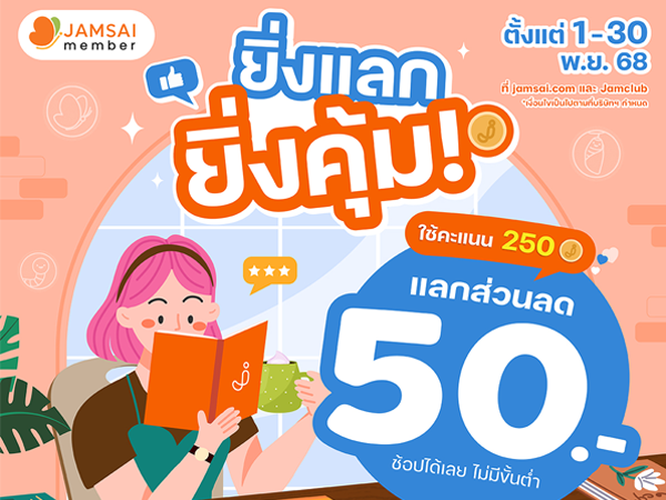ยิ่งแลกยิ่งคุ้ม! ตลอดทั้งเดือนพฤศจิกายน สมาชิก Jamsai Member ใช้คะแนน Jamsai Point แลกส่วนลด 50.- ไม่มีขั้นต่ำ สิทธิพิเศษนี้เฉพาะ Jamsai Member เท่านั้น ช้อปเลย!